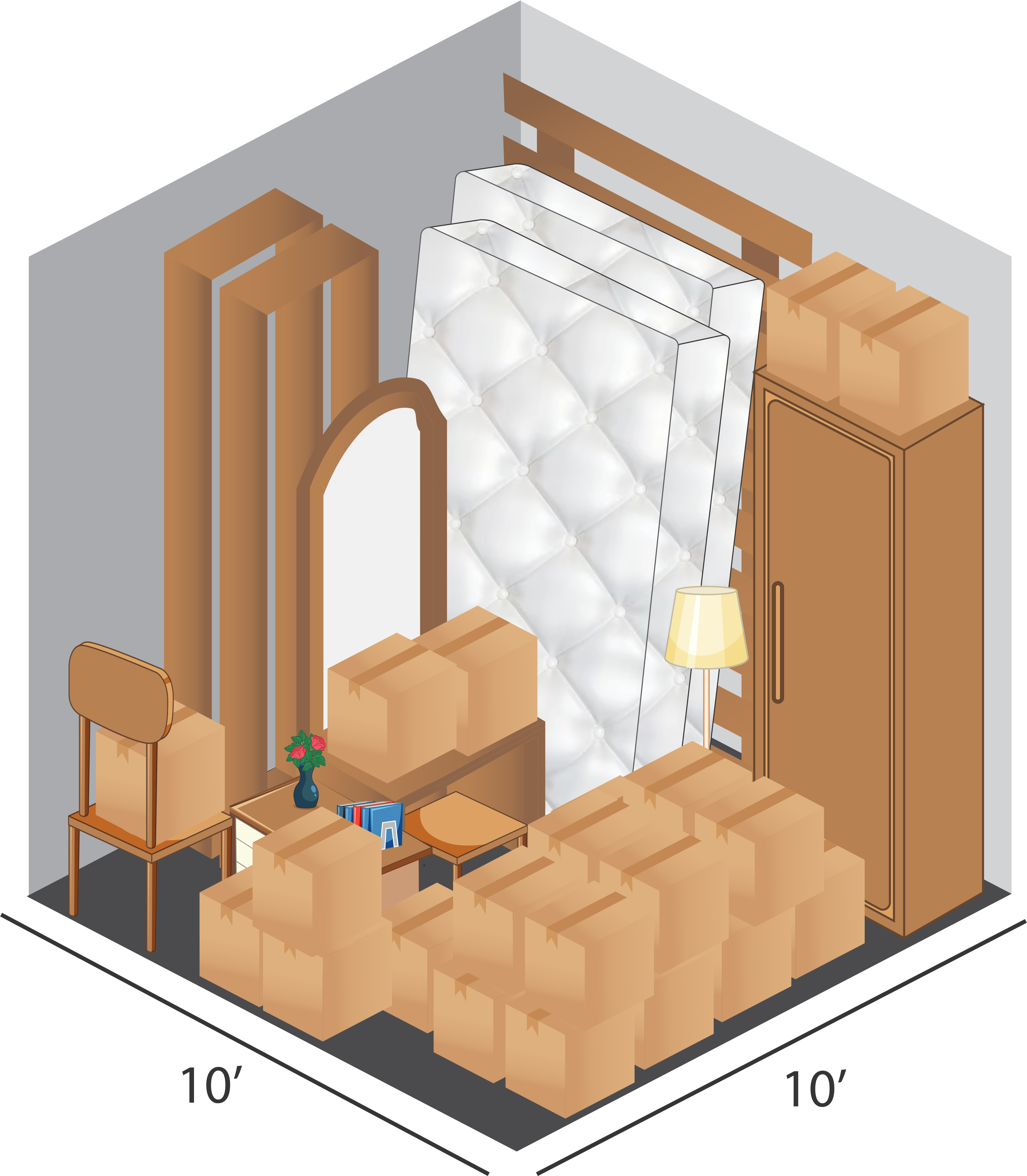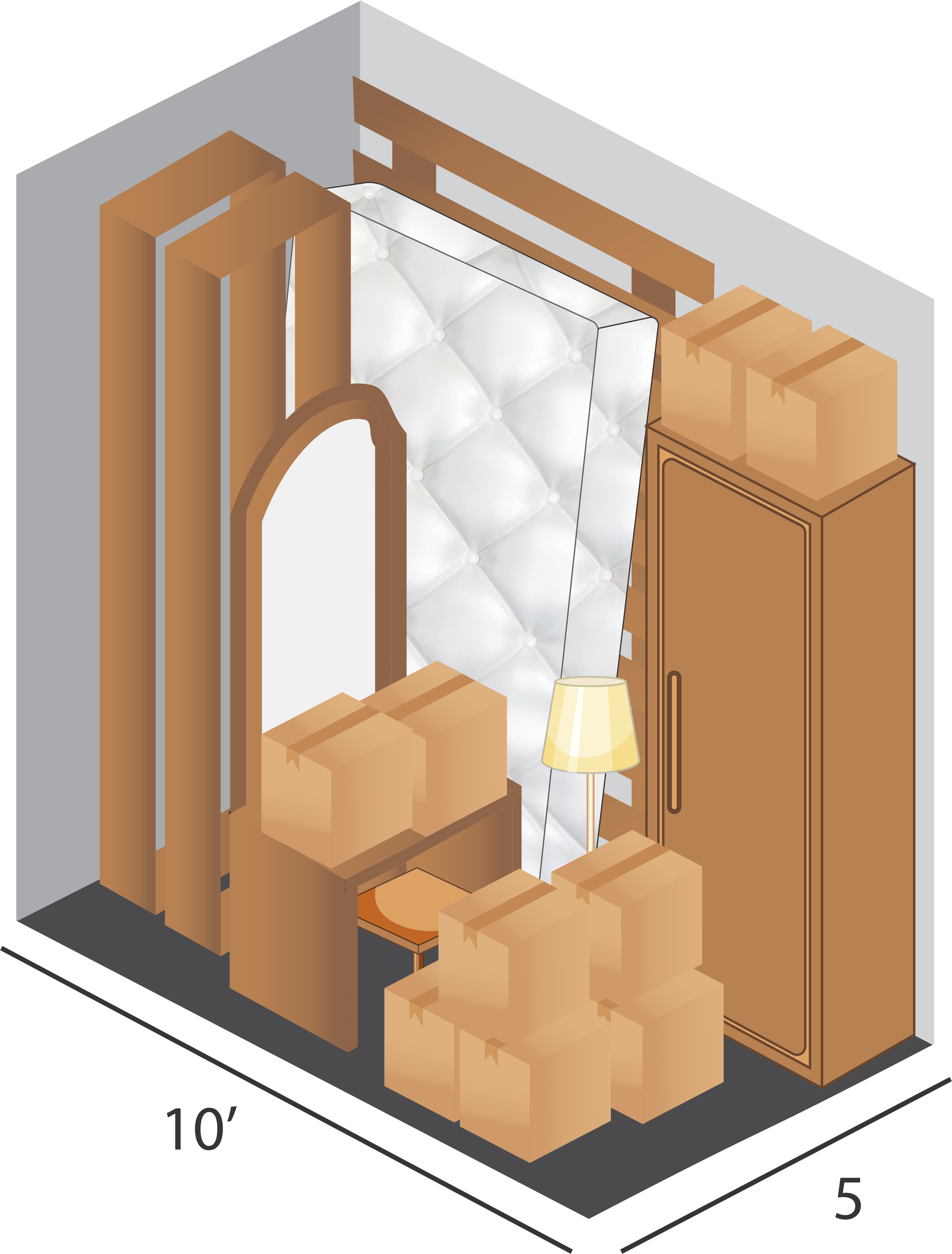 The unit is equivalent to a Small Walk-in Closet (50 sq ft) and will hold the furnishings of a mid-sized bedroom including small furniture, queen-sized bed, and several medium boxes.