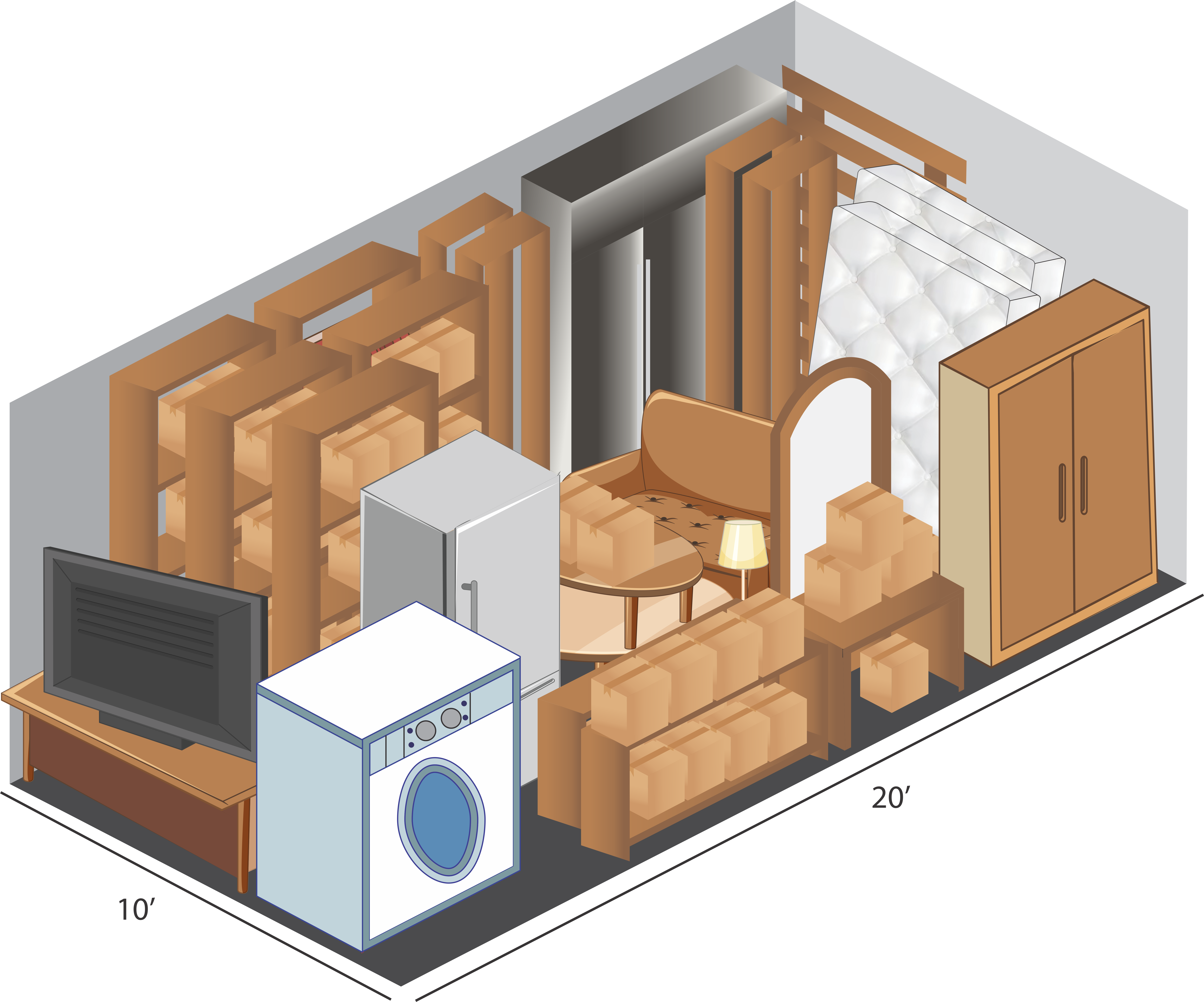 The unit is equivalent to a Standard 1-Car Garage (200 sq ft) and will hold the furnishings of a multi bedroom house with major appliances, large furniture, plus lots of boxes. Works well with storage racks.