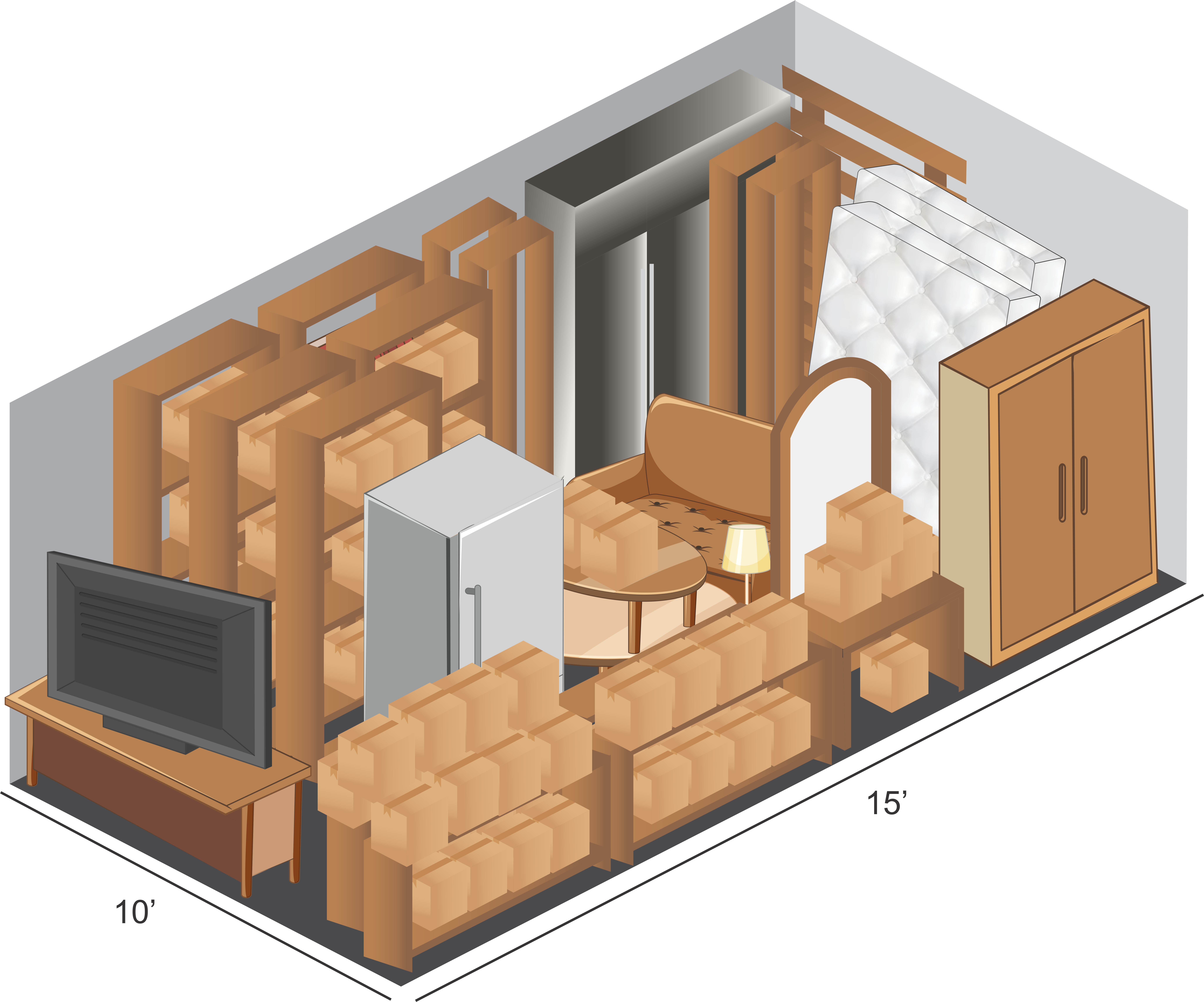 The unit is equivalent to a 1/2 of 1-Car Garage (100 sq ft) and will hold the furnishings of two bedrooms.